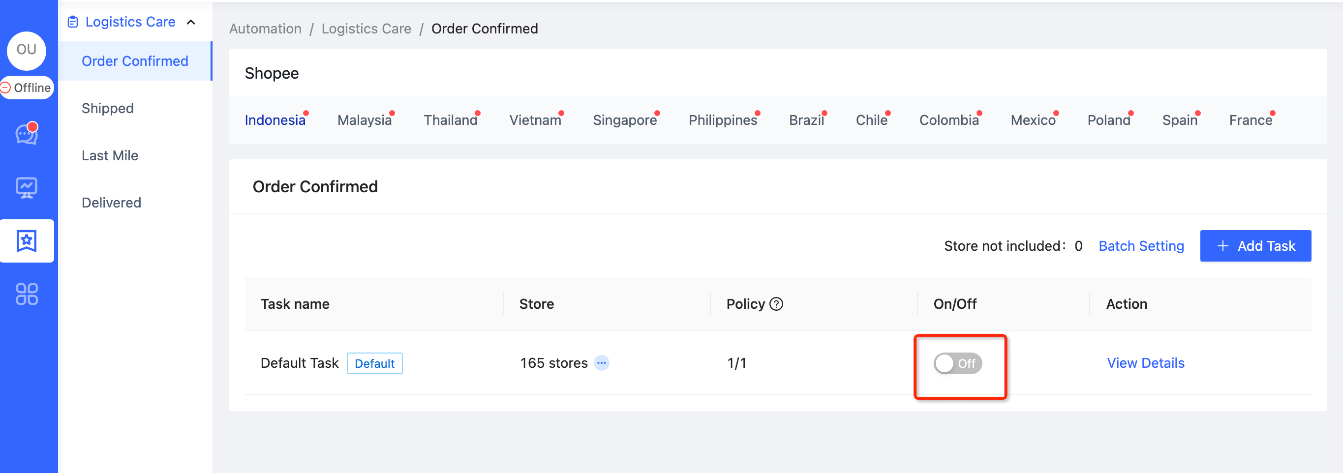 💡 Newly authorized stores will be automatically included to【Default task】. However, the store will not be automatically included again after they are removed from other tasks. It will be counted as "Store not included" (left side of red box⑥ in Figure 6). You can click "Batch Setting" button (right side of red box⑥ in Figure 6) to add massive stores into the certain task quickly.