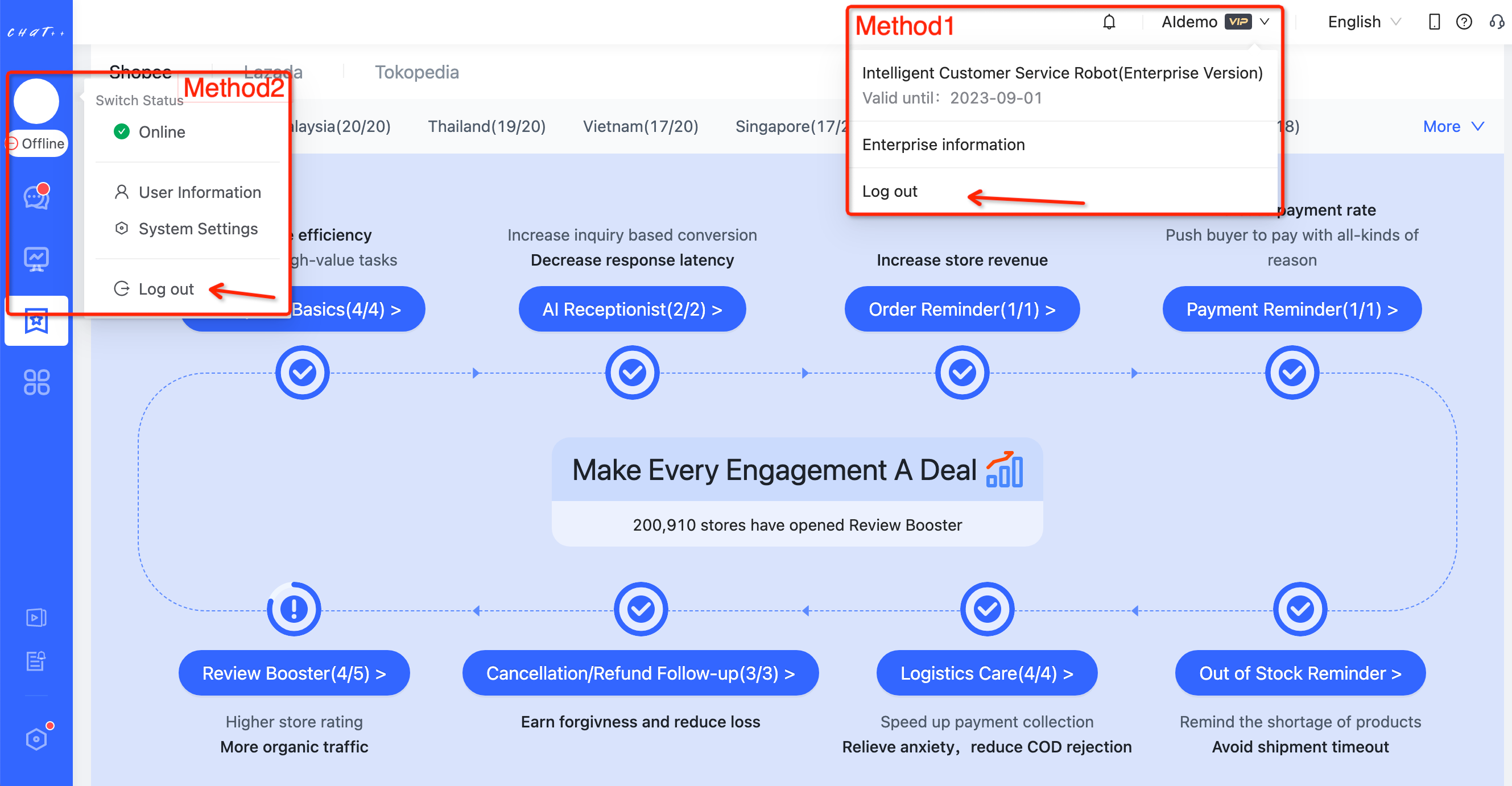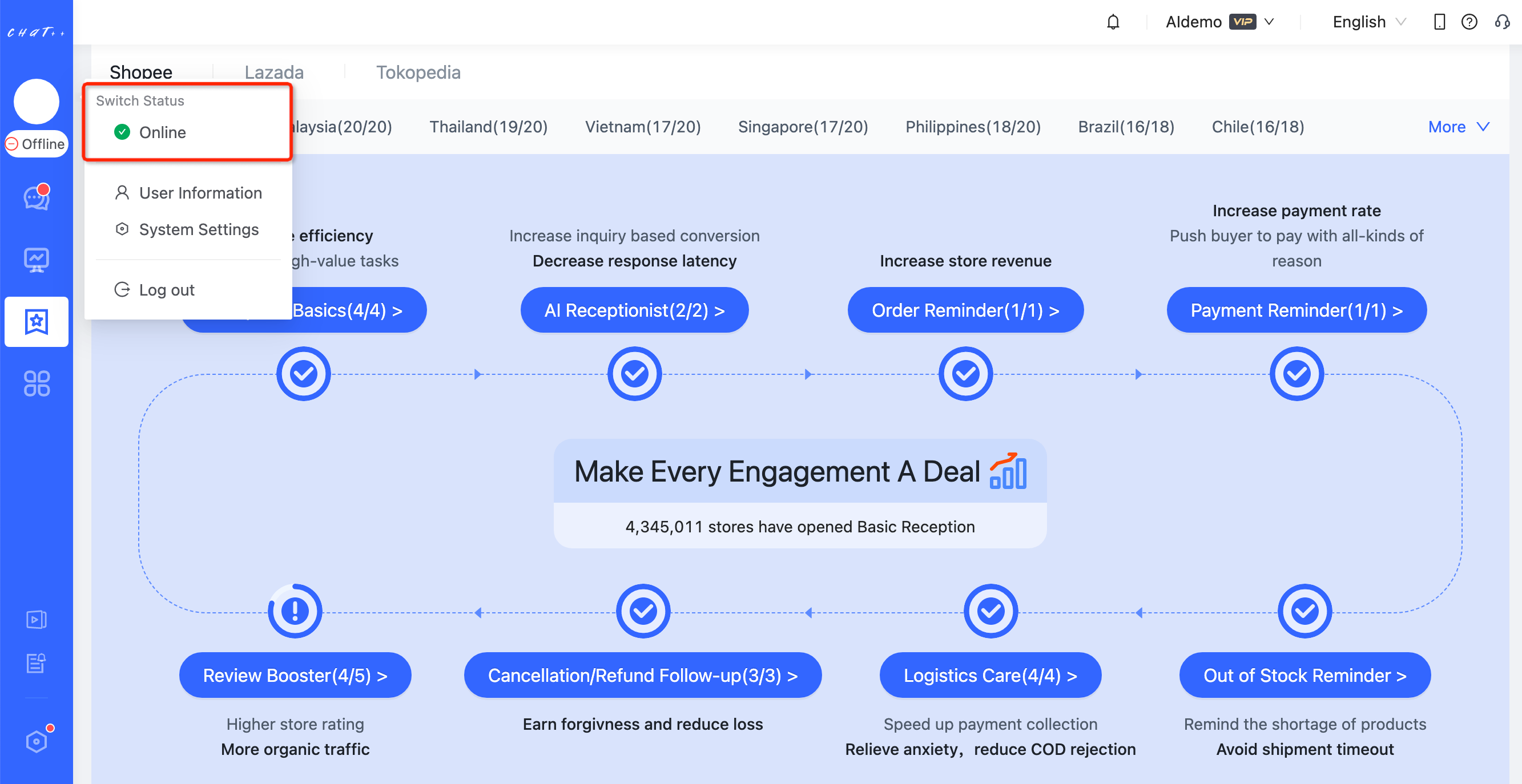 💡 ChatPlusAI is an artificial intelligence (AI) driven customer service workbench specially designed for global e-commerce. It aggregates reception work from mainstream global e-commerce marketplaces through their official APIs. At this moment, 5 marketplaces Shopee, Lazada, Tiktok, Tokopedia, WhatsApp and 11 countries are well supported.
