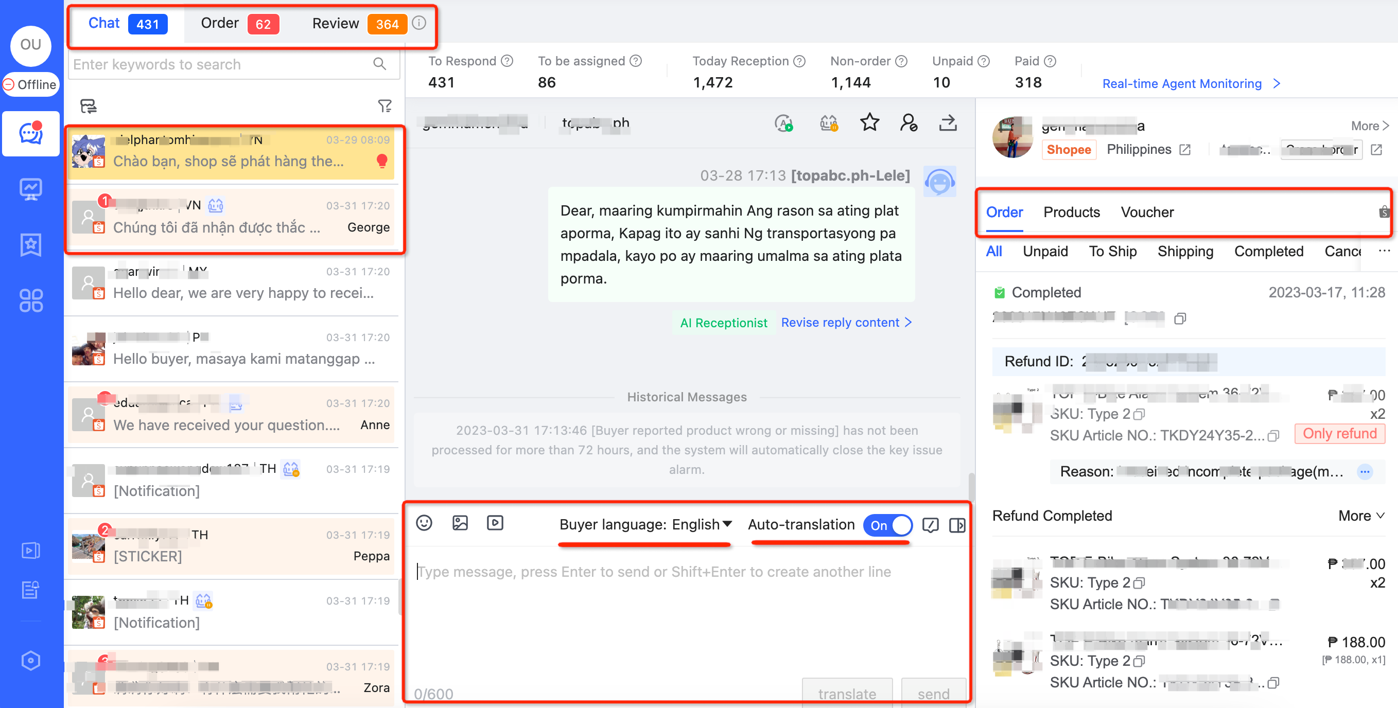 🧰 7. Comprehensive Reception Toolbox: auto-translation, message shortcuts, time-out reply, on-duty mode, buyer blacklist etc.